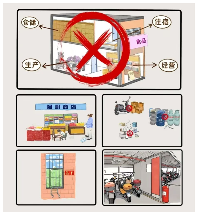 隐患问题:商铺一层维修电动自行车,住宿1人,住宿区域与经营区未进行防火分隔、未设独立安全出口。