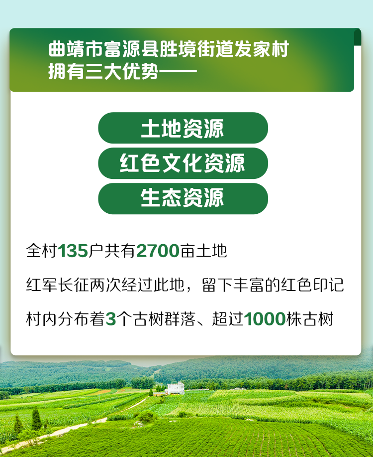 发家村拥有土地资源、红色文化资源和生态资源三大优势。全村135户共有2700亩土地,红军长征两次经过此地,留下丰富的红色印记,村内还分布着3个古树群落,超过1000株古树。过去,这些资源未能有效转化,村民守着好资源却过着穷日子。