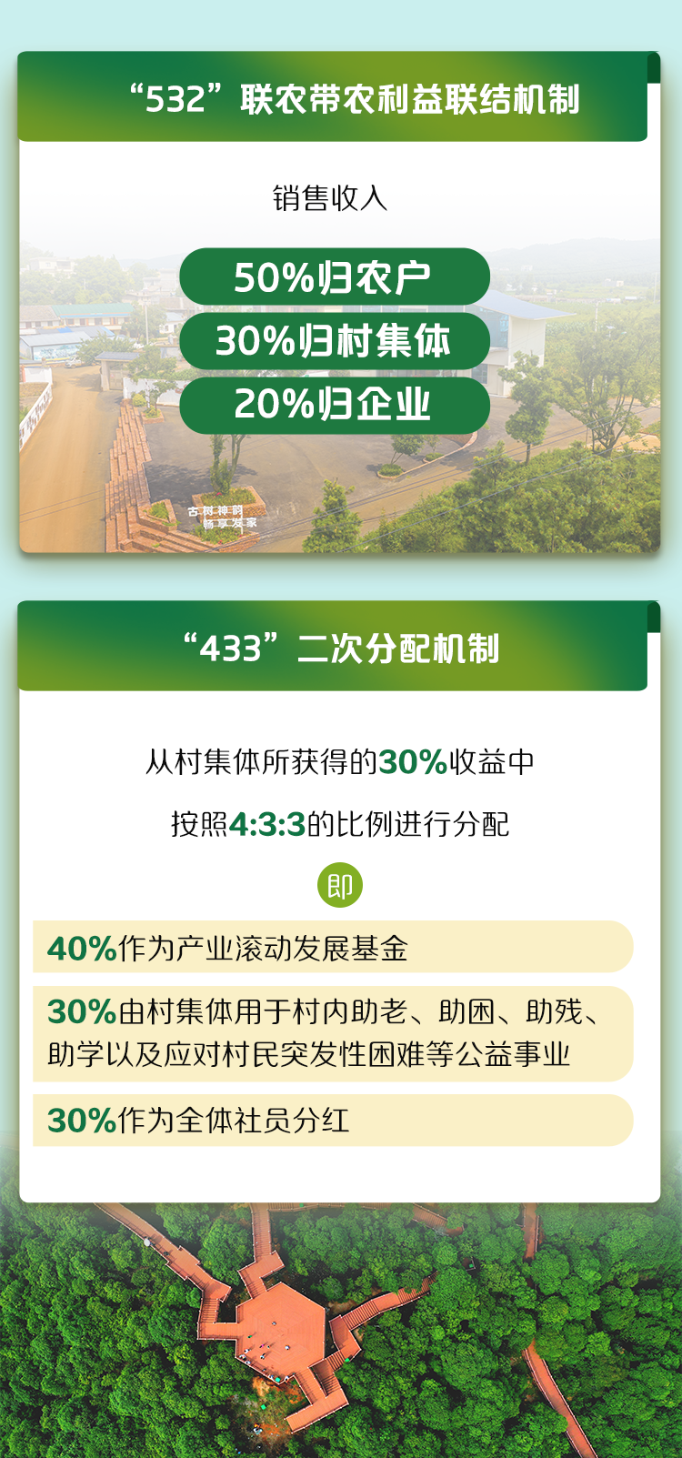 “532”机制即销售收入的50%归农户、30%归村集体、20%归企业;“433”机制指从村集体所获得的30%收益中,按照4:3:3的比例进行分配,即40%作为产业滚动发展基金,30%由村集体用于村内助老、助困、助残、助学以及应对村民突发性困难等公益事业,30%作为全体社员分红。