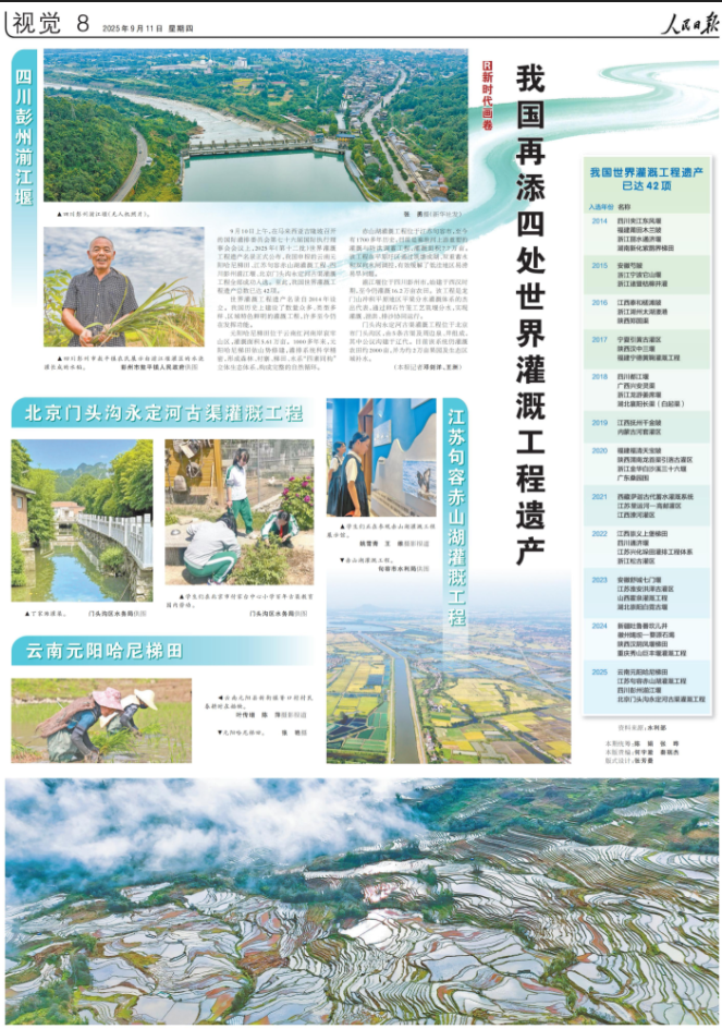 9月10日上午,在马来西亚吉隆坡召开的国际灌排委员会第七十六届国际执行理事会会议上,2025年(第十二批)世界灌溉工程遗产名录正式公布,我国申报的云南元阳哈尼梯田、江苏句容赤山湖灌溉工程、四川彭州湔江堰、北京门头沟永定河古渠灌溉工程全部成功入选。至此,我国世界灌溉工程遗产总数已达42项。