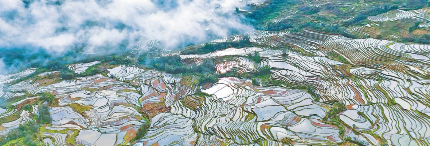 元阳哈尼梯田位于云南红河南岸哀牢山区,灌溉面积5.61万亩。1000多年来,元阳哈尼梯田依山势修建,灌排系统科学精密,形成森林、村寨、梯田、水系“四素同构”立体生态体系,构成完整的自然循环。