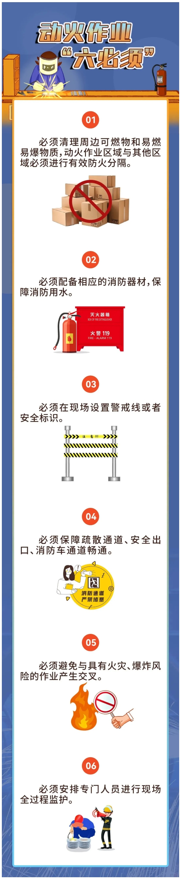 作业人员必须持证上岗,动火作业必须清理周边可燃物和易燃易爆物质,动火作业区域与其他区域必须进行有效防火分隔;必须配备相应的消防器材,保障消防用水;必须在现场设置警戒线或者安全标识;必须保障疏散通道、安全出口、消防车通道畅通;必须避免与具有火灾、爆炸风险的作业产生交叉;必须安排专门人员进行现场全过程监护。