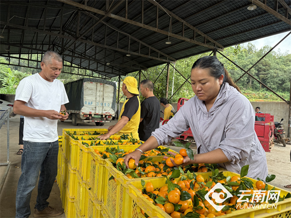 在位于果洛垤小组村口的一个收购点,交售金秋砂糖橘的果农、运输车辆络绎不绝。工人们正进行称重、分拣、打包、装车,一批批新鲜砂糖橘即将发往全国各地。据了解,当前上市的是首批金秋砂糖橘,因上市时间早、品质优,市场行情一路向好,每公斤售价达从18元到20元不等,价格稳定且需求旺盛。