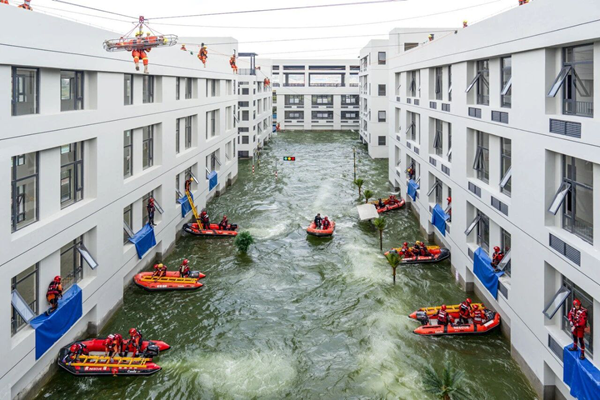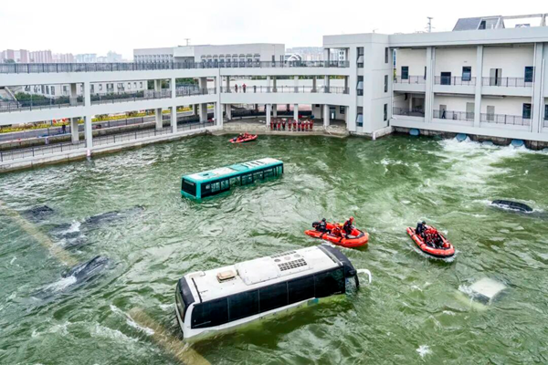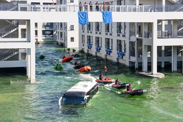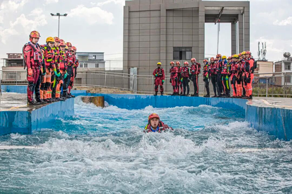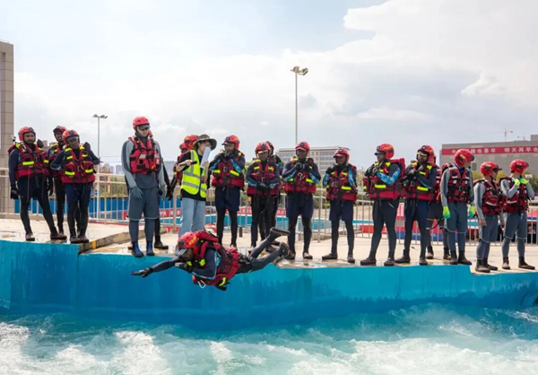 此次建成的二期项目占地63亩,核心建筑为1.2万平方米的城市内涝救援训练模块,其规模目前居全球首位。该模块集成了水域体能训练馆、直升机(水域)救援训练馆、城市立体空间救援训练模块等先进设施,可模拟急流涡险、车辆落水、建筑地下淹没等多种灾情,实现全场景、高仿真的专业化训练。
