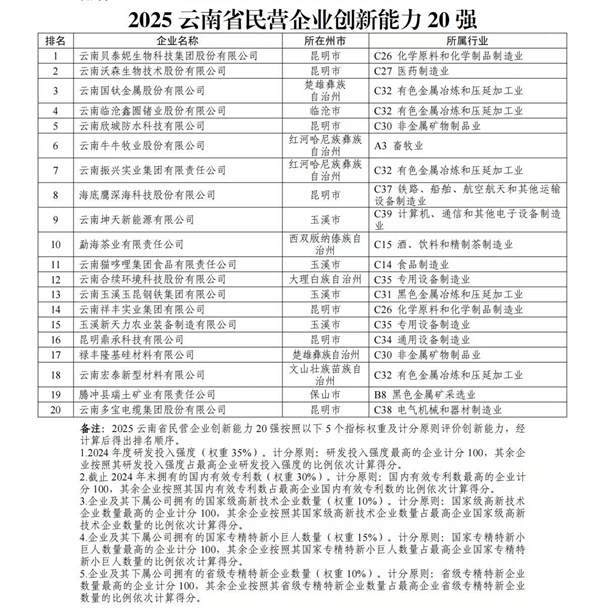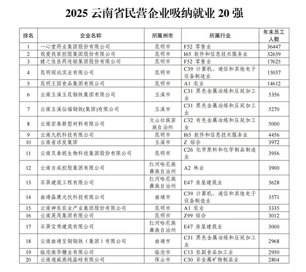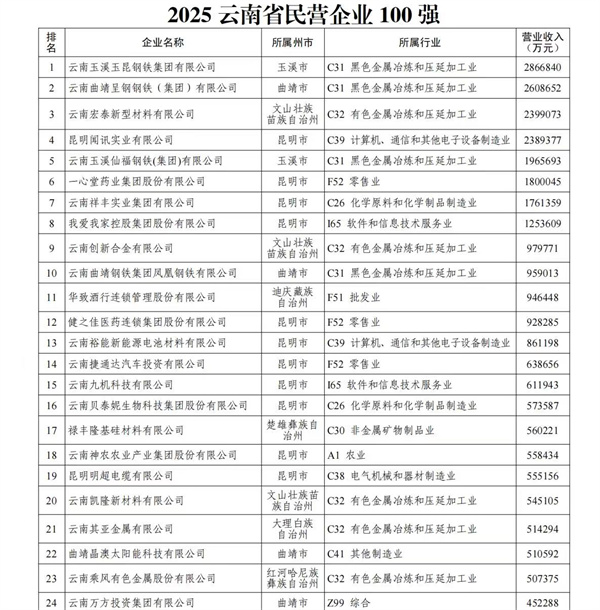 9月19日,省工商联发布2025云南省民营企业100强榜单,揭晓2025年云南省“民营企业100强”“制造业20强”“服务业20强”“创新能力20强”“吸纳就业20强”榜单,并发布《2025云南省民营企业100强分析报告》。报告显示,面对复杂多变的宏观环境,云南民营百强企业展现出发展韧性,整体规模稳中有进,产业结构持续优化,创新与社会贡献稳步推进,为全省经济高质量发展注入动力。