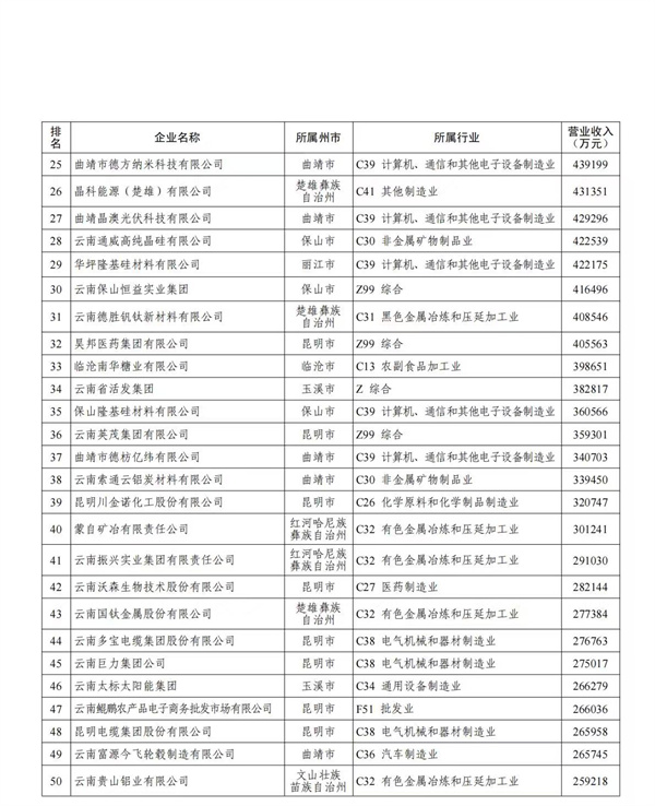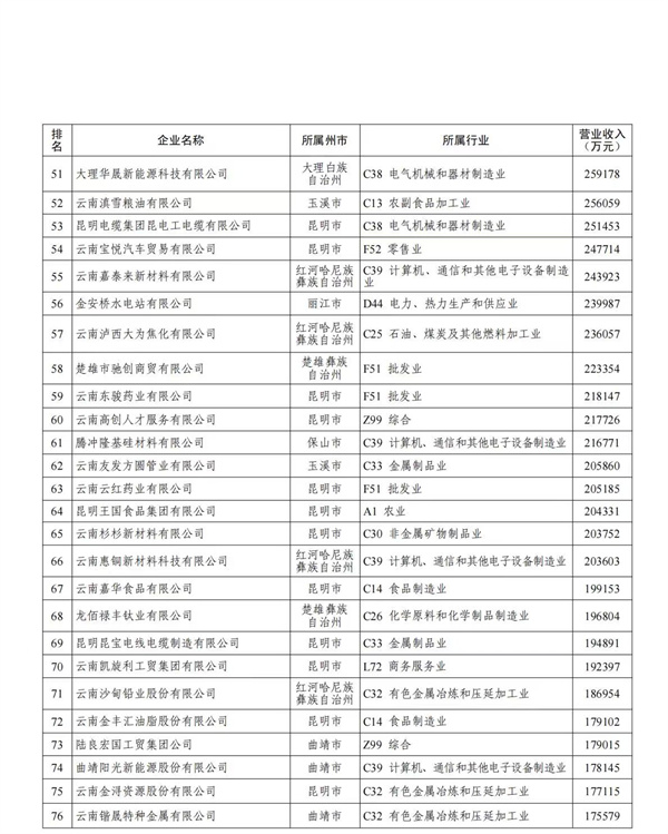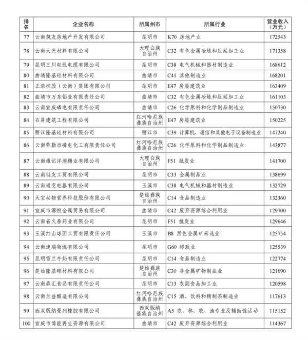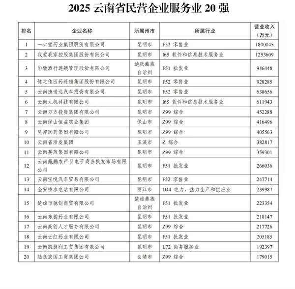 此次发布榜单中,云南玉溪玉昆钢铁集团有限公司、云南曲靖呈钢钢铁(集团)有限公司、云南宏泰新型材料有限公司位列 “民营企业100强”及“制造业20强”前三甲;服务业20强由一心堂药业集团股份有限公司、我爱我家控股集团股份有限公司、华致酒行连锁管理股份有限公司领衔。