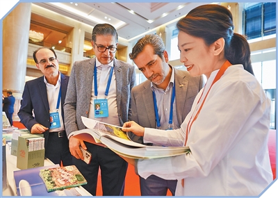 2025“一带一路”媒体合作论坛主会场,与会嘉宾通过书籍了解云南省情。记者 蒋雨师 摄
