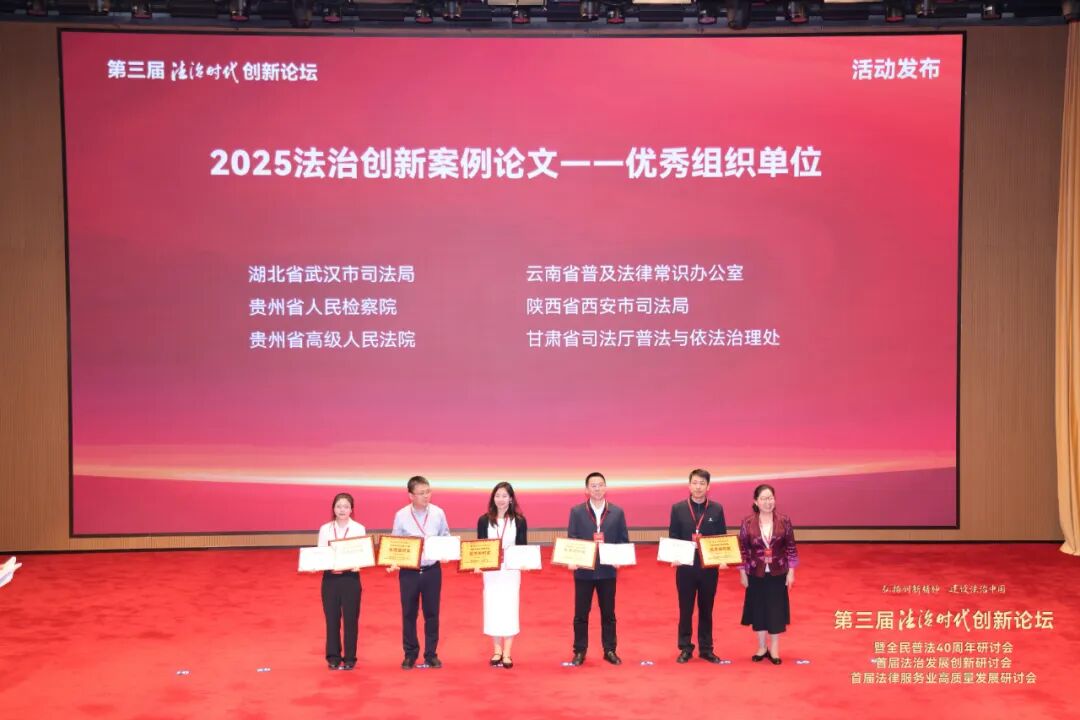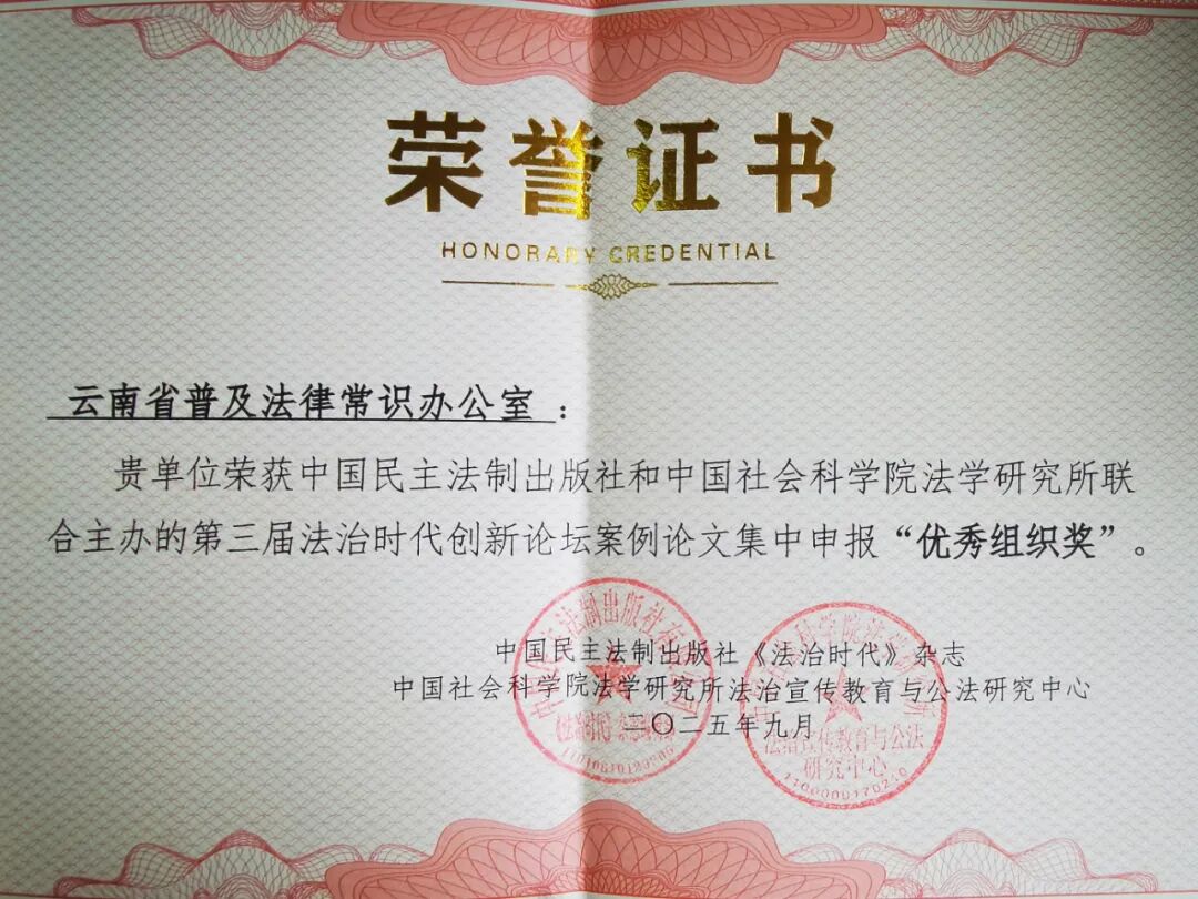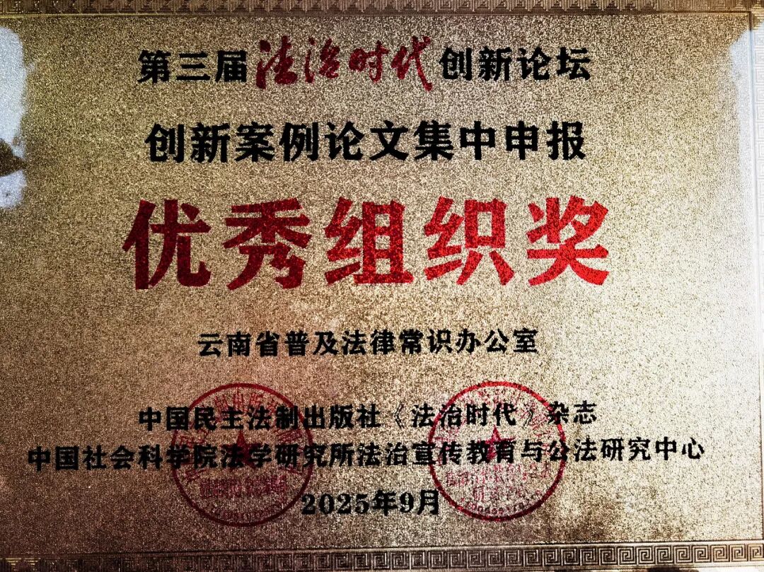 在论坛表彰中,云南省普及法律常识办公室被评为法治创新集中申报"优秀组织单位"。