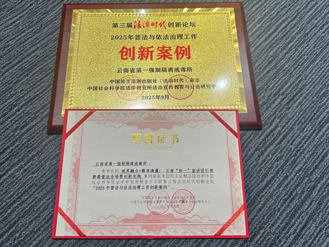 云南司法行政戒毒系统省第一强制隔离戒毒所撰写的"破界融合+精准滴灌:云南'如一'宣讲团引领禁毒普法全场景创新实践"成功入选2025年普法与依法治理工作创新案例。"如一"禁毒普法宣讲团成立以来,省第一强戒所致力于创新普法形式,创作普法内容,将禁毒普法从"纸上文字"变成"身边故事",目前已开展40余场普法宣讲,覆盖5万余名师生和社会群众,其创新模式得到法治日报社等多家媒体的高度评价,为全国普法工作提供了可参考、易复制的云南方案。
