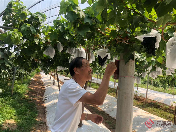 昆明兰露梦农业科技有限公司董事长张宝龙在基地里查看葡萄长势。