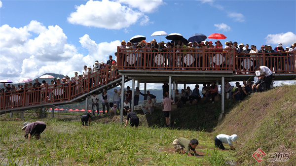 参加活动的群众在观看摸鱼比赛 李海坤 摄