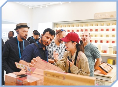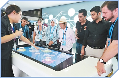 中外媒体嘉宾到中国能建总部调研参观,外媒记者与中方工作人员交流。