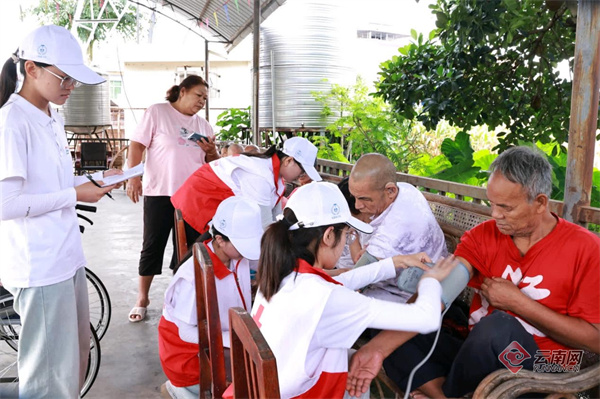 在瑞丽市敬老院,实践队员带着专业的医疗知识和饱满的热情为老人们提供义诊服务,为老人量血压、测血糖,仔细追问既往病史、用药细节。面对高血压、关节炎等老年慢性病,给出个性化健康建议,手把手教日常护理要点。陪老人聊天时,听他们讲过去的故事。“孩子们一来,这里就热闹了,不仅身体舒服了,心里也暖烘烘的。”一位在敬老院的王大妈拉着队员的手说。