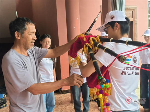 景颇族象脚鼓制作工坊中,队员们化身“学徒”,沉浸式体验传统工艺;学习演奏“巴扎”乐器,在气息控制、节奏练习中,听懂民族文化的独特韵律。当健康专业遇上非物质文化遗产传承,队员们发现,民族文化里藏着“疗愈力”,专业知识也能为文化传承注入活力——这是一场双向奔赴,让青春在跨界探索中,找到服务乡村的新可能。