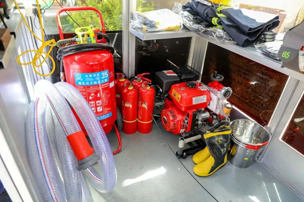 箱体内部按“取用便捷、功能分区”原则,科学设置三个核心模块:核心灭火单元配备水带、水枪、灭火器及灭火防护服等基础装备,满足初期火灾扑救需求;适应性扩展单元配备手抬机动泵、手推式干粉灭火器等设备,确保缺少市政消火栓的情况下也能进行初期控制;智能控制单元配备集成智能主机、可视对讲摄像头、GPS定位模块及智慧宣传屏,实现“防、救、宣”一体化功能联动。