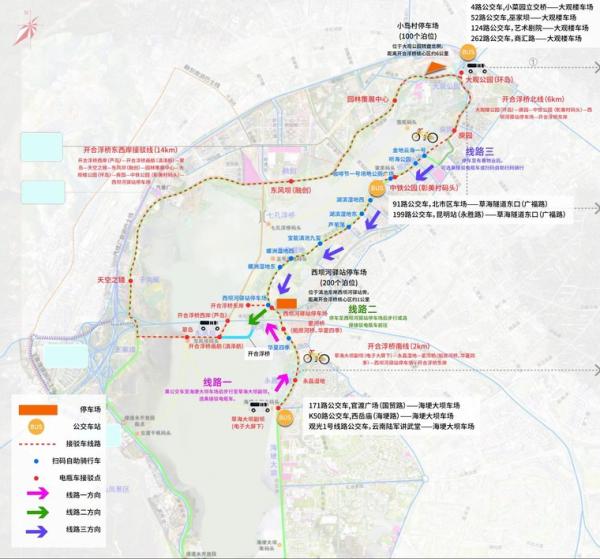 此外,从草海西岸前往的市民与游客,可以把车停到融创文旅城,然后步行至东风坝,从东风坝中段进入开合浮桥。从西山公园附近进入,也可以将车停放在碧鸡博览园附近停车场,步行至东风坝中段,进入开合浮桥。