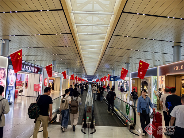 为让旅客在机场就能感受节日喜悦与云南特色文化,云南省内各机场精心布置航站楼空间,打造“最云南”的空港文化客厅。昆明长水机场在航站楼出发大厅主干道两侧悬挂起鲜艳的五星红旗,浓烈的爱国氛围扑面而来;同时推出“茶马古道”文化体验活动,通过实景展陈马帮、传统服饰、清代“泉声茶韵”牌匾等元素,让旅客在等候航班之余,沉浸式感受云南悠久历史文化。