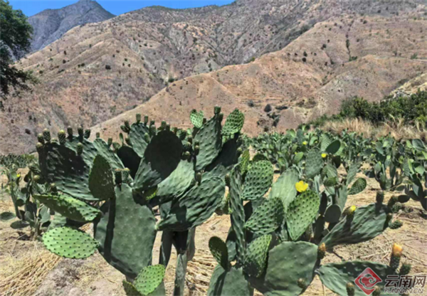 秋风送爽,金沙江畔的拖脚村依旧暖意融融。站在山腰远眺,漫山遍野的仙人掌连绵成片,犹如一片“绿色海洋”。肥厚的叶片上晨露晶莹,一簇簇粉红色的仙人掌果如红宝石般缀满枝头,在骄阳下泛着诱人的光泽。村民们三三两两,正在地里弯腰除草,笑语声与山风交织,诉说着丰收的喜悦。这里便是宁蒗彝族自治县金棉乡拖脚村千亩仙人掌基地,谁也不曾想到,这片曾经石多土薄、干旱少雨的干热河谷,如今竟孕育出一个年产值超百万元的绿色产业。