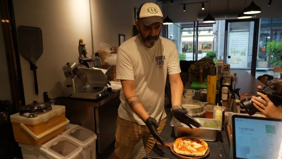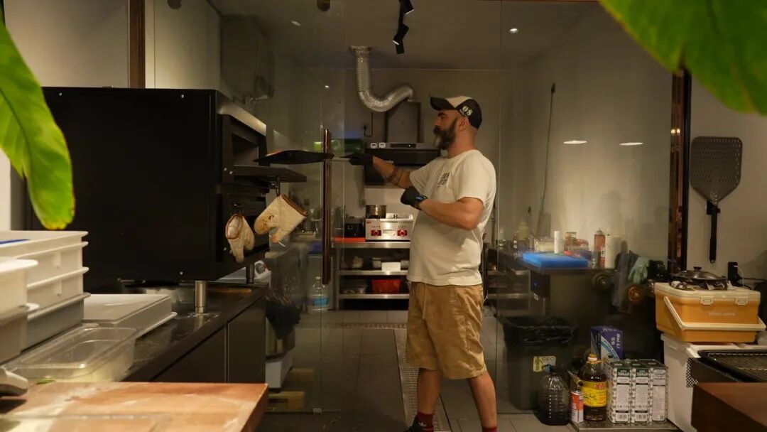“叮!”随着烤箱响起清脆的提示音,李自由戴着围裙,端出一份冒着热气的披萨。饼底边缘烤得金黄微焦,上面铺着切片的老窝火腿、马苏里拉芝士、樱桃番茄和罗勒——这是他独创的“老窝火腿披萨”,也是餐厅的招牌。