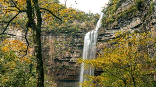 小草坝的山,因水而活。“渴驼饮泉”“银河飞瀑”等景点在秋日里别具风韵,虽然秋天的水量不及夏季丰沛,但却更显清澈与幽静。流水潺潺,蜿蜒在五彩的树林间,像一条银色的丝带,瀑布从崖壁飘洒而下,水声淙淙,给寂静的山林带来空灵的回响,山与水交相呼应,共同勾勒出一幅“山水如诗”的诗意长卷。