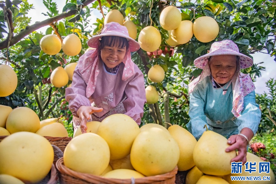 在云南省西畴县鸡街乡下坝村,村民正在采摘柚子(10月15日摄)。新华网发(熊平祥 摄)