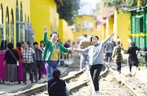 游客在米轨上拍照纪念。记者 赵伟 摄