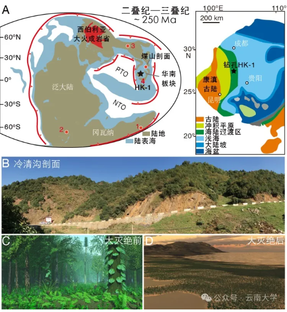 2.5亿年前,地球上最严重的一场生物灾难席卷全球——超过八成海洋物种、七成陆地脊椎动物消失。长期以来,科学界普遍认为,北半球西伯利亚的大规模火山喷发是这场灾难的“元凶”。然而,近日云南大学牵头的一项最新研究表明,这场灭绝的重要环境指标碳—硫循环扰动并非全球同步爆发,而是经历了分阶段、区域性爆发的过程。相关成果发表于国际著名学术期刊《美国科学院院刊》(PNAS),揭示了远古陆地生态危机从“局部失衡”走向“全球系统性危机”的演化机制,也为今天的气候变化研究提供了重要警示。