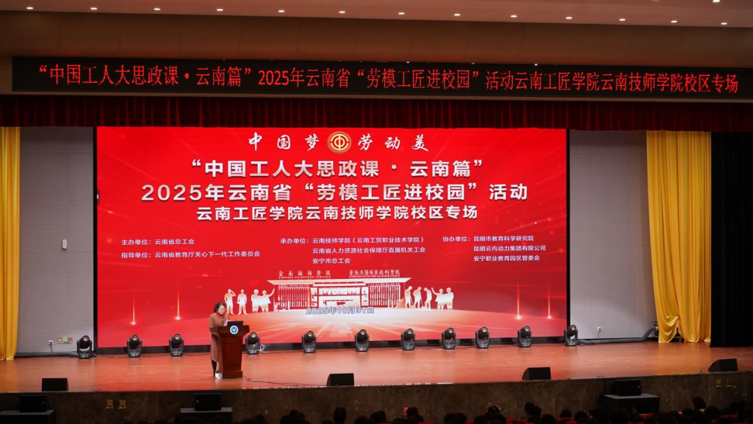 为大力弘扬劳模精神、劳动精神、工匠精神,激励青年学子技能成才、技能报国,10月31日下午,由云南省总工会主办,云南省教育厅关心下一代工作委员会指导,云南技师学院(云南工贸职业技术学院)承办的“中国工人大思政课·云南篇”——“劳模工匠进校园”专场活动在学校顺利开展。本次活动紧扣“弘扬‘三个精神’ 助力成长成才”主题,创新策划并扎实开展了内涵丰富的“五个一”系列教育实践,包括一场主题宣讲、一次现场互动、一堂精品录播课、一次实地参观、一场创新工作室交流,多层次、多角度引导师生深刻感悟“三个精神”的时代价值。