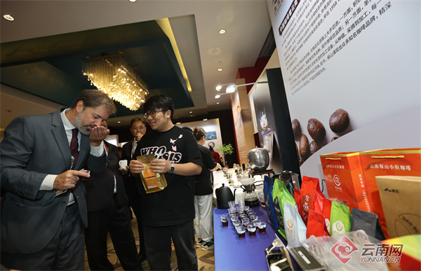 云南与跨国企业对话会上,云咖香味引来外国客商。记者 黄兴能 摄