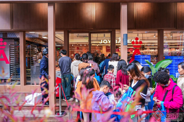 在滇忆465街区的“嘉华”门店,等候消费的队伍延伸出二十多米。“平均每3秒钟就核销一个套餐,从九点开门到现在,仅一小时就售出近千套。”店长兴奋地表示,这样的火爆场面实属罕见。不仅是嘉华,霸王茶姬、上客过桥米线、祥云里宜良烤鸭主题餐厅、云彩文创……整个滇忆465街区近百家商铺门前都排起了长龙。