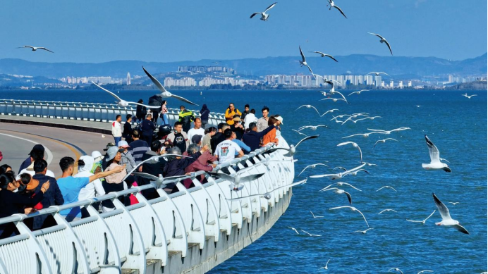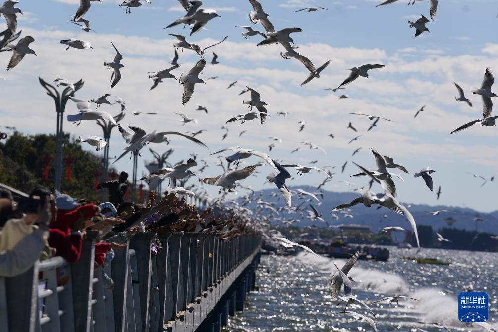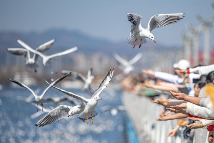 游客在昆明滇池海埂观景大道观赏红嘴鸥。