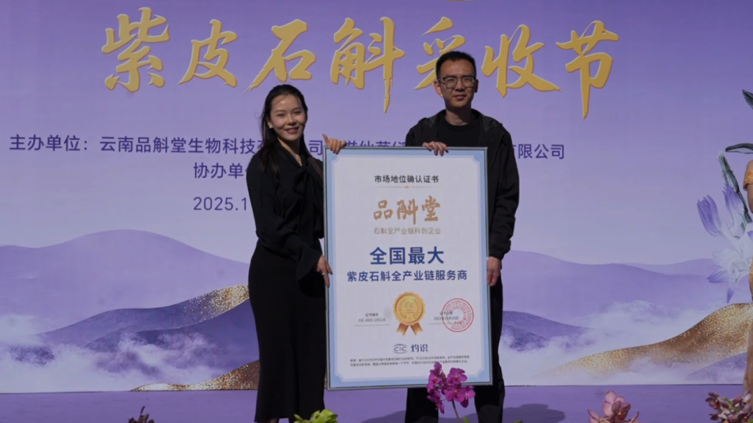 市场认证书颁发是开幕式的亮点环节,CIC灼识咨询执行董事朱芳向企业代表颁发了品斛堂--中国紫皮石斛全产业链第一品牌、品斛堂--全国最大紫皮石斛全产业链服务商、品斛堂--中国石斛原浆消费者满意度第一、元斛--中国石斛原浆领导品牌、品斛堂酒业--中国石斛露酒开创者、品斛堂酒业--石斛酒中国销量第一6个市场地位认证书。活动还为年度品质之星、“助农大传”颁发聘书,出席活动的嘉宾用“金剪刀”剪下成熟的紫皮石斛鲜条,象征着产业丰收与发展新篇的开启。