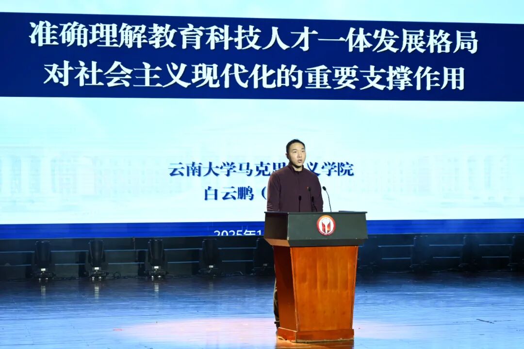 开场曲《盛世国乐》以悠扬的民乐合奏展现了中华文化的博大精深,让师生们沉浸在浓厚的文化氛围中。云南大学副教授白云鹏首先登台,以《准确理解教育科技人才一体发展格局对社会主义现代化的重要支撑作用》为题,紧扣二十届四中全会关于一体推进教育科技人才发展的新部署,从国家战略高度剖析了教育、科技、人才三者之间的内在联系,强调了三者协同发展对推动社会主义现代化建设的关键作用;云南开放大学马克思主义学院教授欧文辉带来了“提升治理效能的指南——学习《习近平谈治国理政》第五卷”的精彩宣讲,他从理论高度阐述了国家治理体系和治理能力现代化的重要性,并结合实际案例分析了治理能力现代化的优势,为师生学习提供指引。