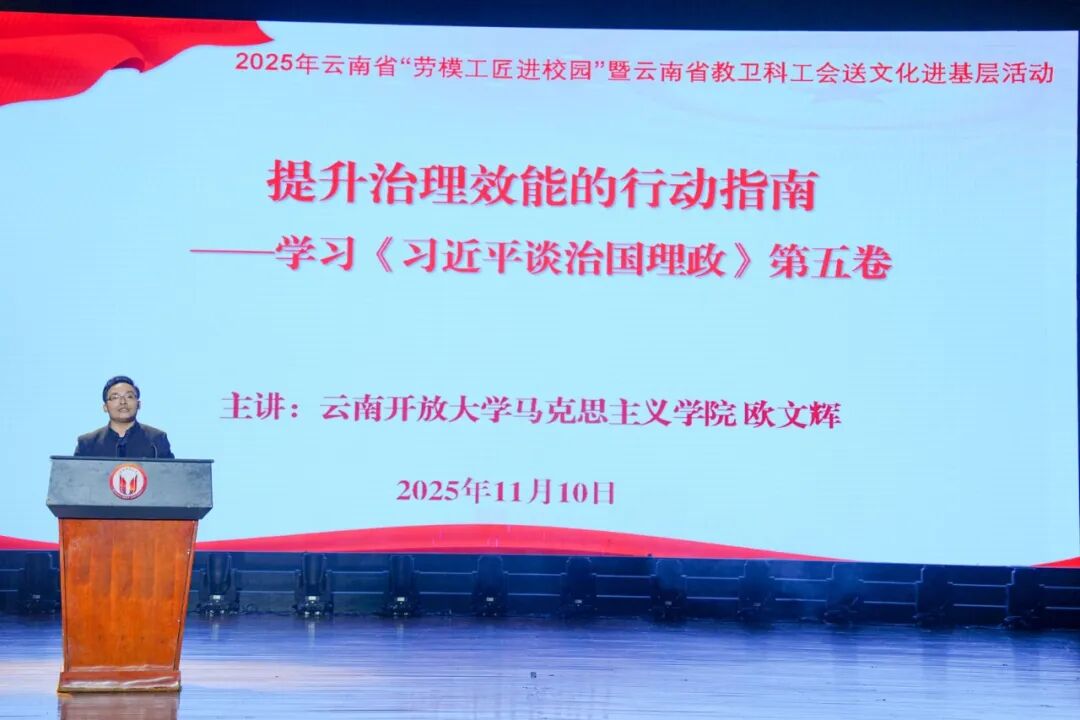 为深入学习贯彻党的二十届四中全会精神、习近平总书记考察云南重要讲话精神以及习近平总书记关于“大思政课”的重要指示批示精神,11月10日,由省总工会和省教卫科工会主办的“中国梦 劳动美——‘中国工人大思政课·云南篇’2025年云南省劳模工匠进校园暨云南省教卫科工会送文化进基层活动”在云南开放大学举行。省总工会党组成员、副主席李琦出席活动。