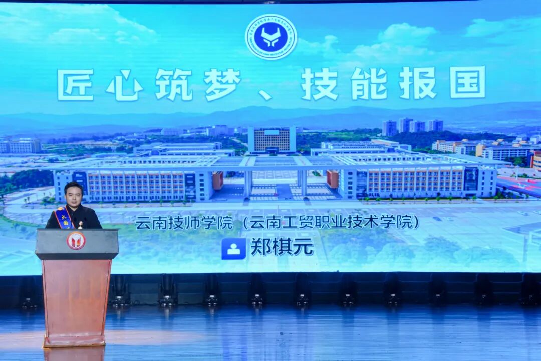 活动中,全国先进工作者、2025年大国工匠人才、云南技师学院教师郑棋元以《匠心筑梦 技能报国》为题,深情讲述了自己勤学苦练、精益求精,从一名普通学生到世界技能大赛舞台上为国争光的拼搏历程。他的故事没有豪言壮语,却充满了攻坚克难的坚韧与追求极致的执着,完美诠释了“执着专注、精益求精”的工匠精神,赢得了在场师生的阵阵掌声。