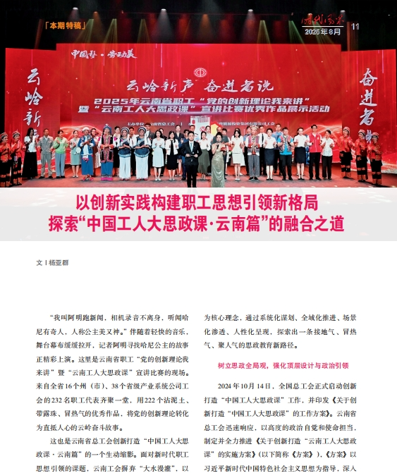 “中国工人大思政课·云南篇”的生动实践说明,思想引领并非刻板的说教,而是有温度、可感知的共鸣与唤醒。它成功地将宏大的理论叙事,转化为云岭大地上一个个具体而微的奋斗故事,将思想政治工作的“天线”精准接到了工厂车间、边境村寨的“地气”。通过系统化的顶层设计与全域化的融合渗透,云南工会不仅构建了一个“处处是课堂、时时受教育、人人皆讲师”的思政教育新生态,更关键的是,它让职工从教育的客体转变为主体,在讲述与倾听、示范与效仿中,完成了自我教育与集体激励的升华。这条以职工为中心、与实践相结合、与时代相呼应的新路径,不仅为新时代产业工人队伍建设注入了磅礴的思想动能,也为系统深化职工思想政治引领提供了“云南方案”。展望未来,随着这一创新格局的持续深化,它必将更好地凝聚起云南百万职工的智慧和力量,在谱写中国式现代化云南篇章的壮阔征程中,奏响更为激昂的“工人号子”。(《时代风采》2025年第8期)
