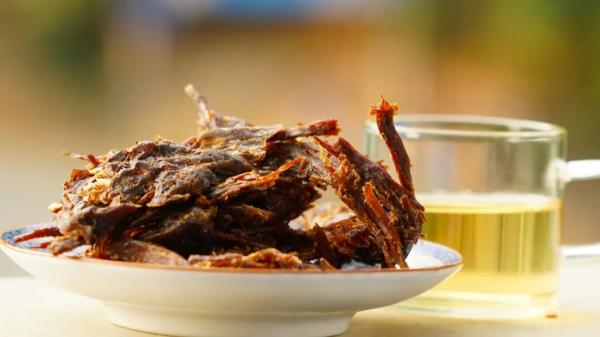 从烤房取出的牛干巴还需最后一道工序:放在干净的菜板上,用木槌轻轻敲打至松软。这一步不仅能让干巴的口感更易咀嚼,还能让藏在肉中的香气更好地释放。品尝时不必急于咀嚼,先将干巴丝含在口中,炭火的焦香与植物香料的清香会慢慢在唇齿间弥漫,待肉质稍作软化后再细细咀嚼,牛肉的本味与佐料的风味相互交织,越嚼越香,越品越有滋味,余味悠长。