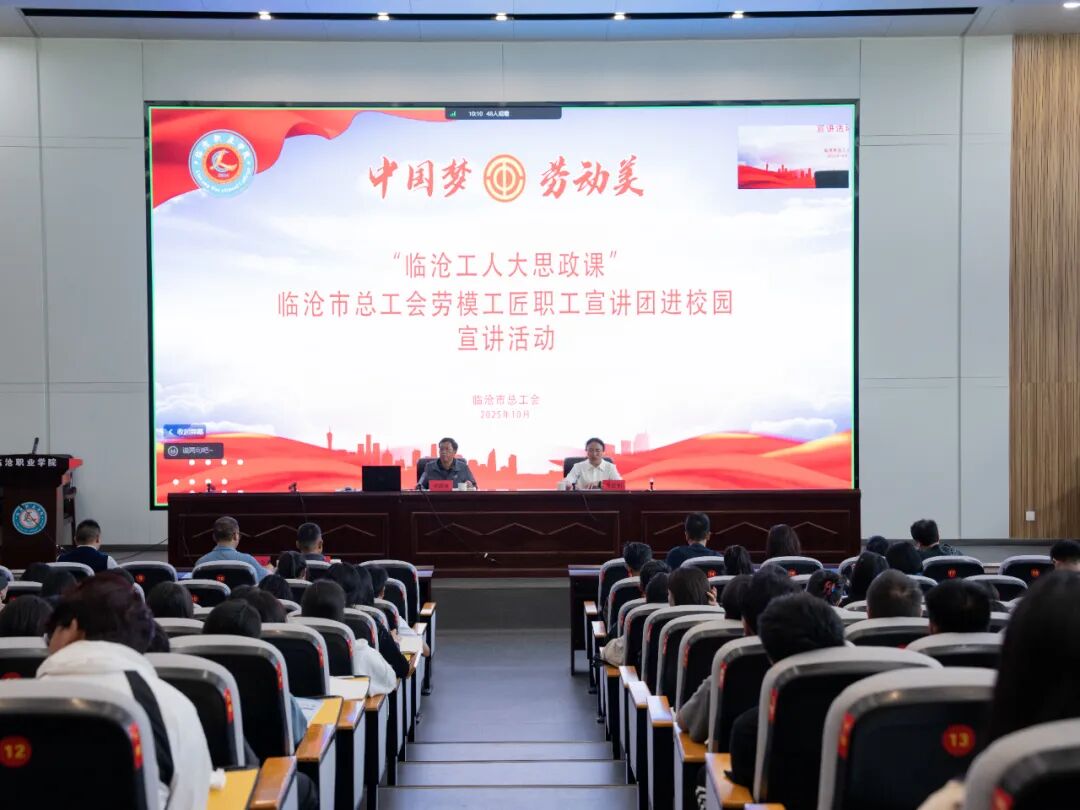 2025年10月29日下午,临沧职业学院报告厅主会场与各班级分会场通过视频连线同步升温,1700余名师生齐聚“临沧工人大思政课”现场,聆听临沧市总工会劳模工匠职工宣讲团带来的奋斗故事。