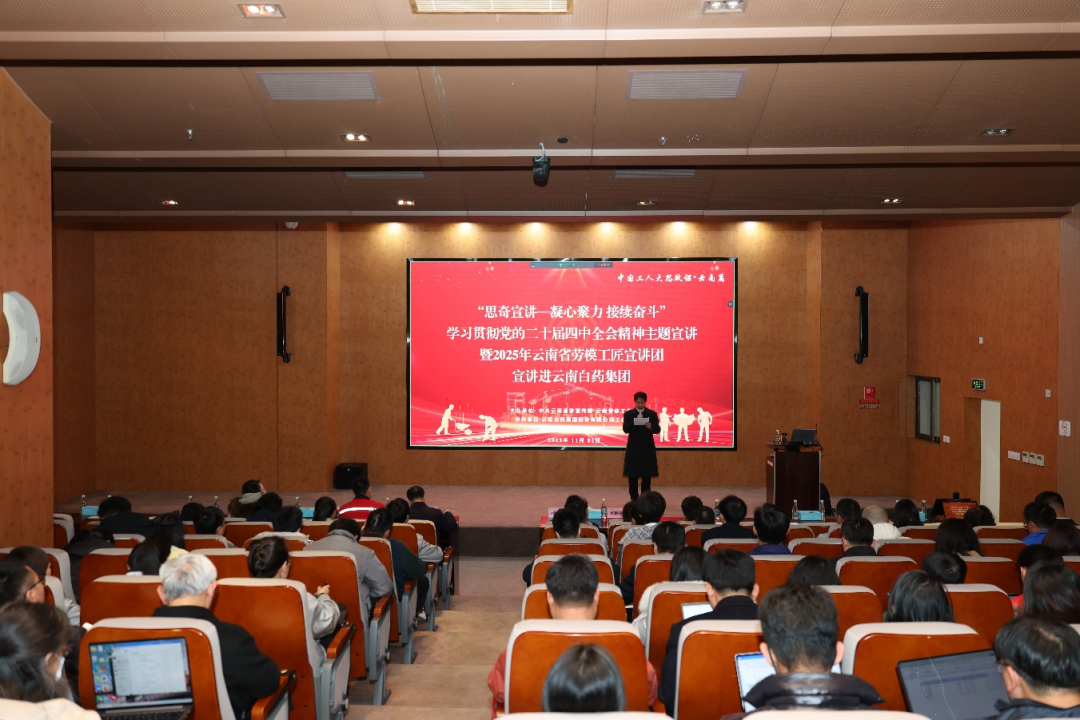 11月21日下午,由中共云南省委宣传部、云南省总工会联合主办,云南白药集团股份有限公司工会承办的“‘思奇宣讲 —— 凝心聚力 接续奋斗’学习贯彻党的二十届四中全会精神主题宣讲暨2025年云南省劳模工匠宣讲团宣讲进云南白药”活动在总部举行。云南省社会主义学院教授、劳模代表与来自各事业群、各公司的一百余名产业工人、共青团骨干、首批“白药工人大思政课”学员同频共振,共学精神、共话未来,共同启动“白药工人大思政课”活动,探索以“思想引领+技能赋能”推动高质量发展的创新路径。