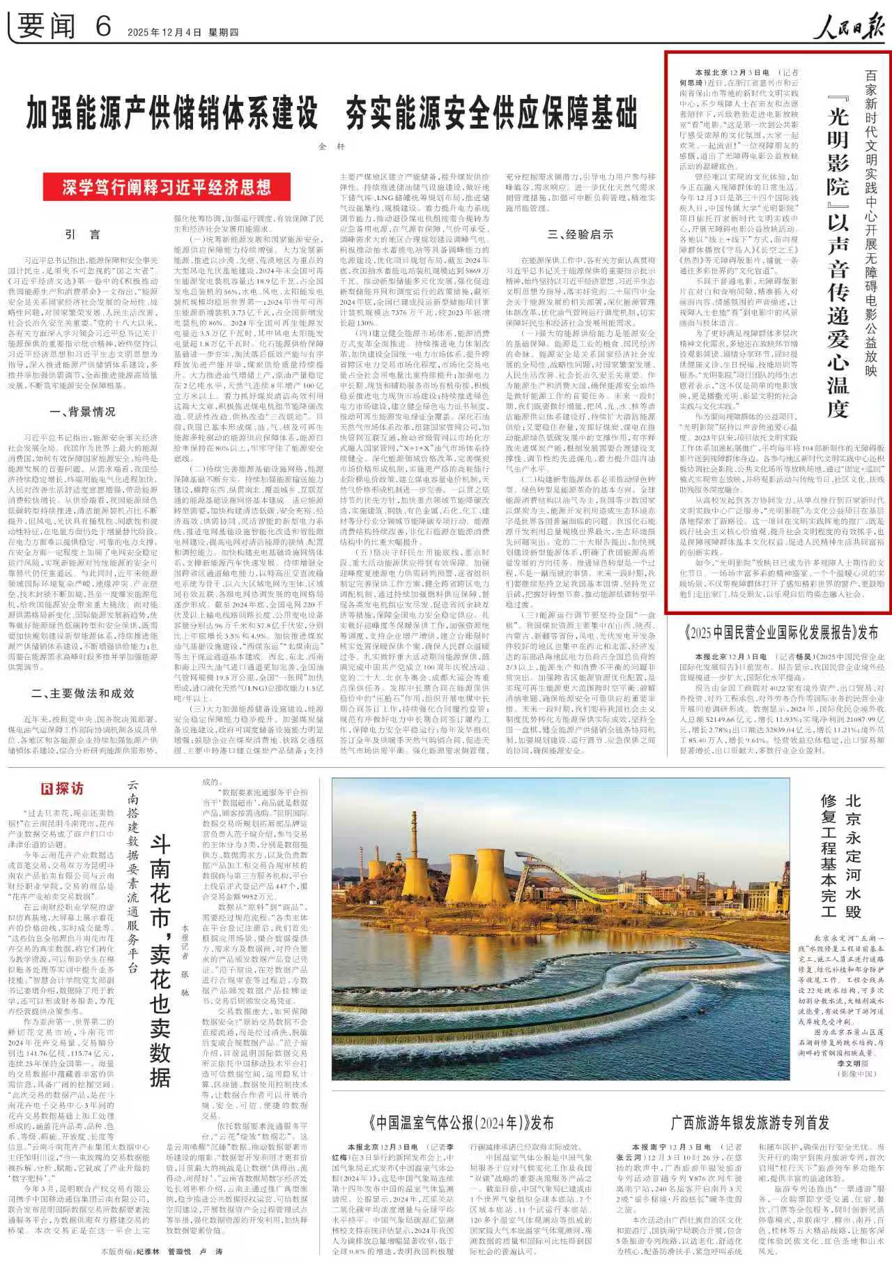 曾经难以实现的文化体验,如今正在融入视障群体的日常生活。今年12月3日是第三十四个国际残疾人日,中国传媒大学“光明影院”项目依托百家新时代文明实践中心,开展无障碍电影公益放映活动。各地以“线上+线下”方式,面向视障群体播放《守岛人》《长空之王》《热烈》等无障碍版影片,铺就一条通往多彩世界的“文化盲道”。