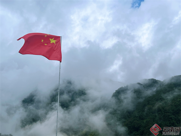她用手机记录下这样一幅画面:背倚青山的独龙族民居沿山坡而筑,每家每户院内高扬的五星红旗顺山势延伸,大风一过,红旗漫卷直向白云升处。