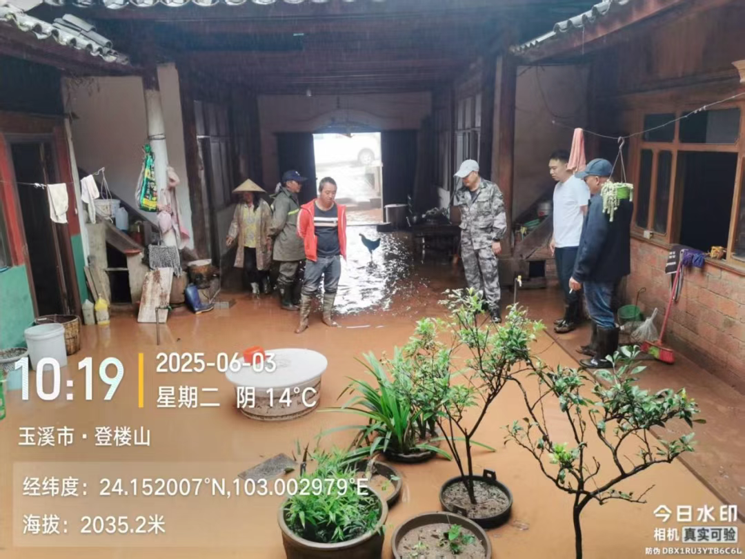 2025年6月3日,华宁县宁州街道登楼山小组一民房因暴雨进水,赵文保带队核查。