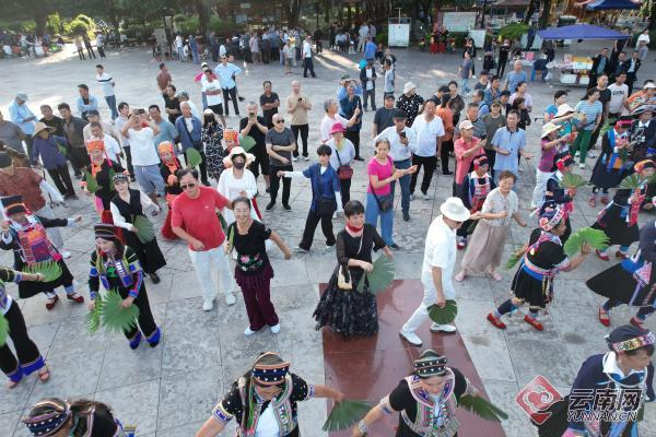 太阳城广场上,一场跨越地域的民族团结盛宴正热闹上演。千余名身着绚丽民族服饰的当地群众,与旅居人欢聚一堂。悠扬的哈尼族乐曲响起,各族群众手持棕扇翩翩起舞,裙摆飞扬间勾勒出浓郁的民族风情;旅居人们被这份热情感染,纷纷跟随着节奏模仿学习,生疏的舞步在欢声笑语中逐渐流畅,陌生感悄然消融,情谊在指尖相传、心间升温。