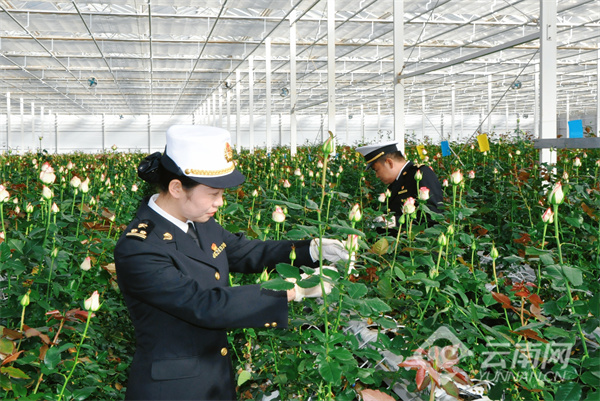 走进丽江现代花卉产业园的智能温室大棚里,昆明海关所属丽江海关关员们正在对花卉种植基地开展日常监管,细致检查有无病虫害等情况,确保鲜切花符合要求、顺利出口。