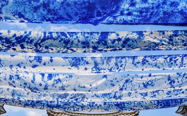 与蓝天白云相映成趣的扎染布 图源:“学习强国”大理州学习平台