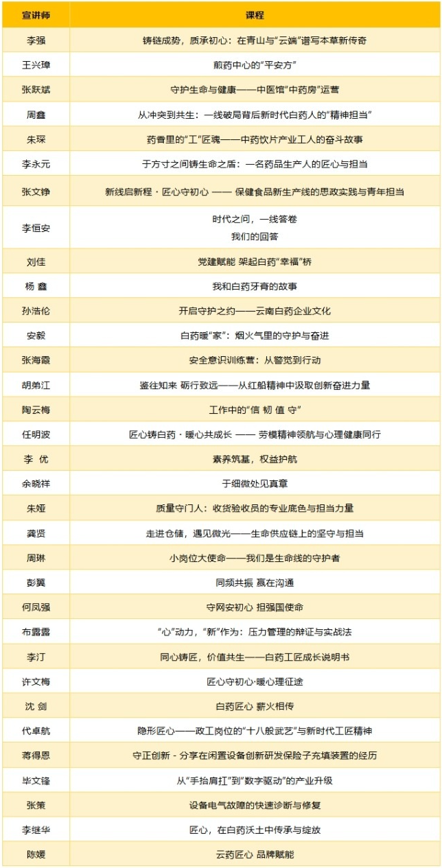 首期“白药工人大思政课”宣讲师及课程库见下表: