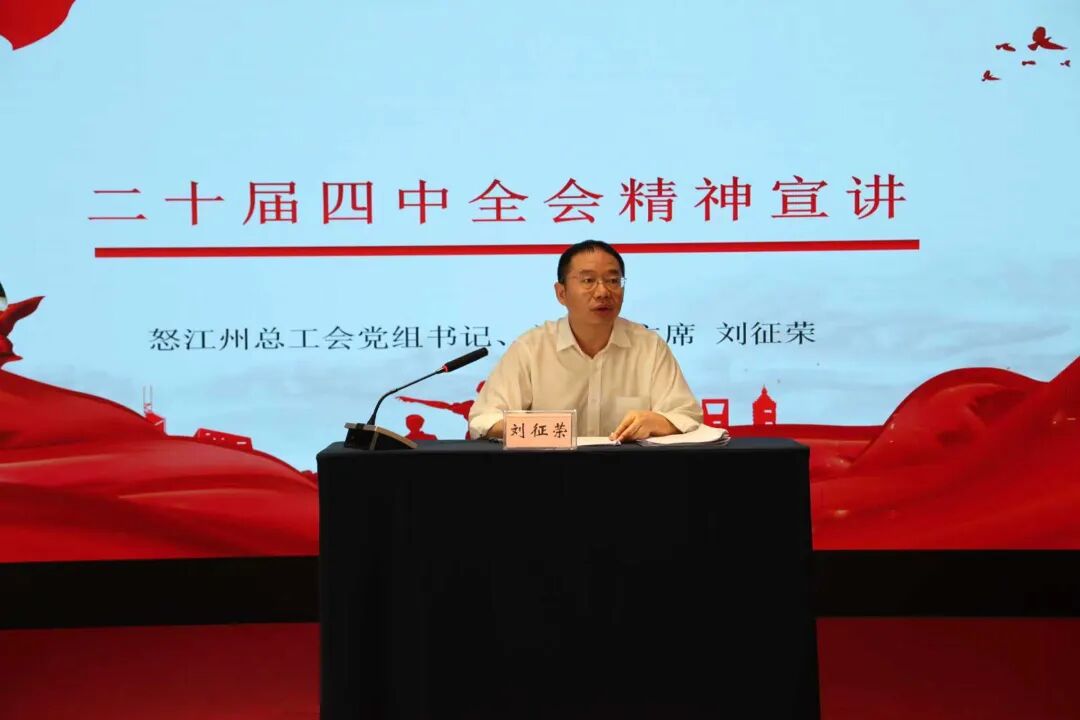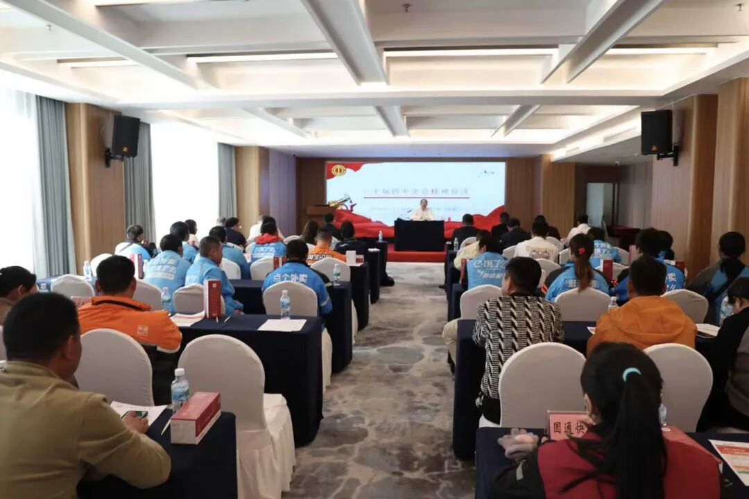 按照州委统一部署,11月14日,学习贯彻党的二十届四中全会精神州委宣讲团在新就业形态宣讲,州委宣讲团成员、州总工会党组书记、常务副主席刘征荣作专题宣讲报告。50余名快递员、外卖员、网约车司机等新就业形态劳动者参加报告会。