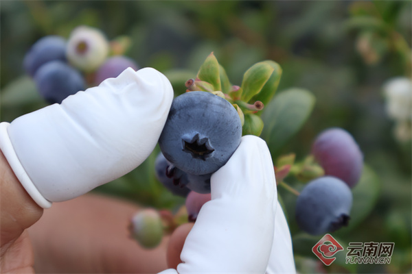 走进德宏傣族景颇族自治州芒市勐戛镇勐稳村芒丙蓝莓种植基地,连片的白色大棚在阳光下格外醒目。棚内绿意盎然的蓝莓植株间,一串串饱满圆润的果实裹着薄薄果粉,蓝紫相间的色泽惹人喜爱。工人们穿梭在果树间,小心翼翼地采摘成熟的果实,一派丰收忙碌的喜人景象。