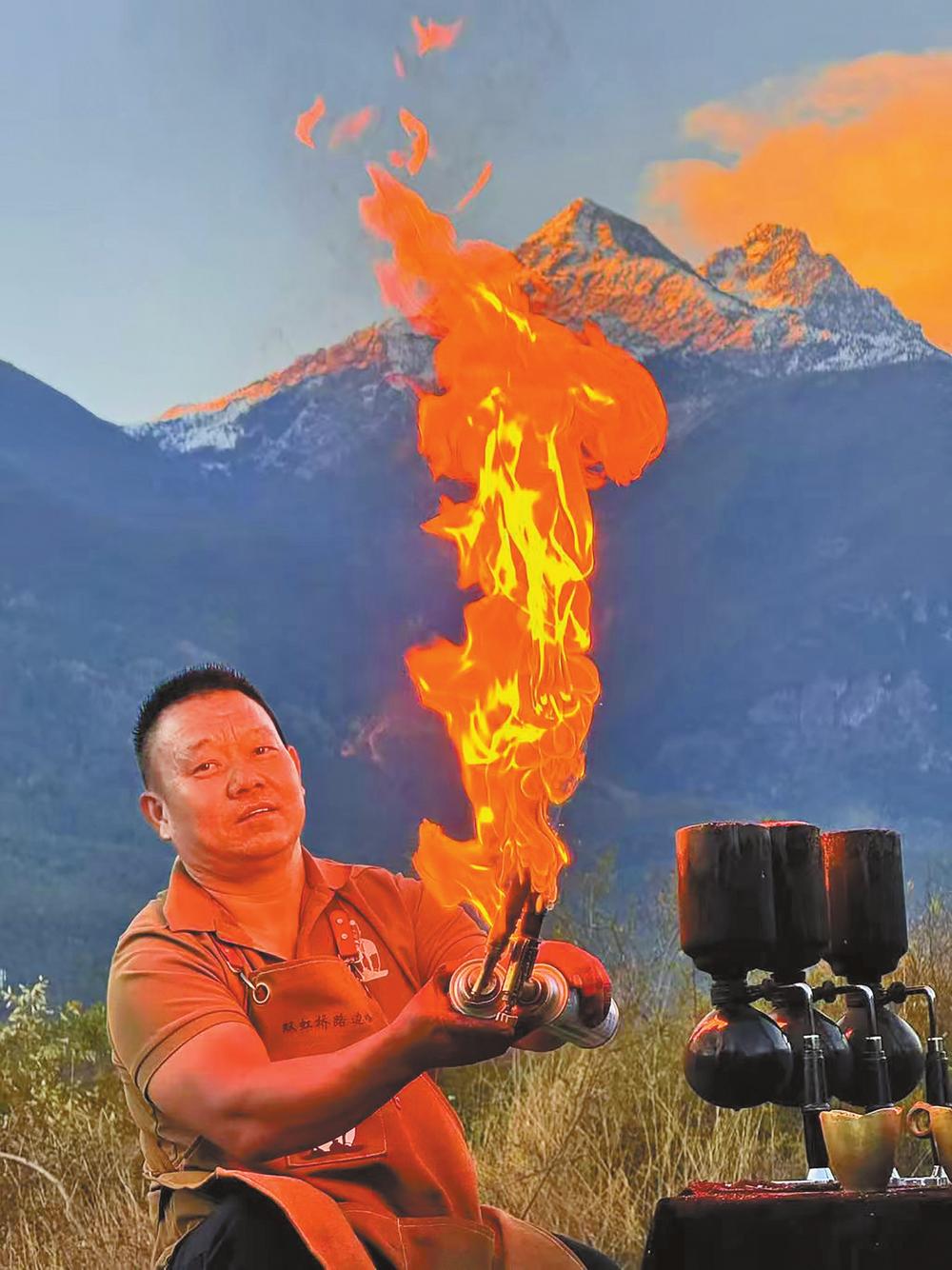 李金合在玉龙雪山下制作“火烧咖啡”。通讯员 杨董清 摄