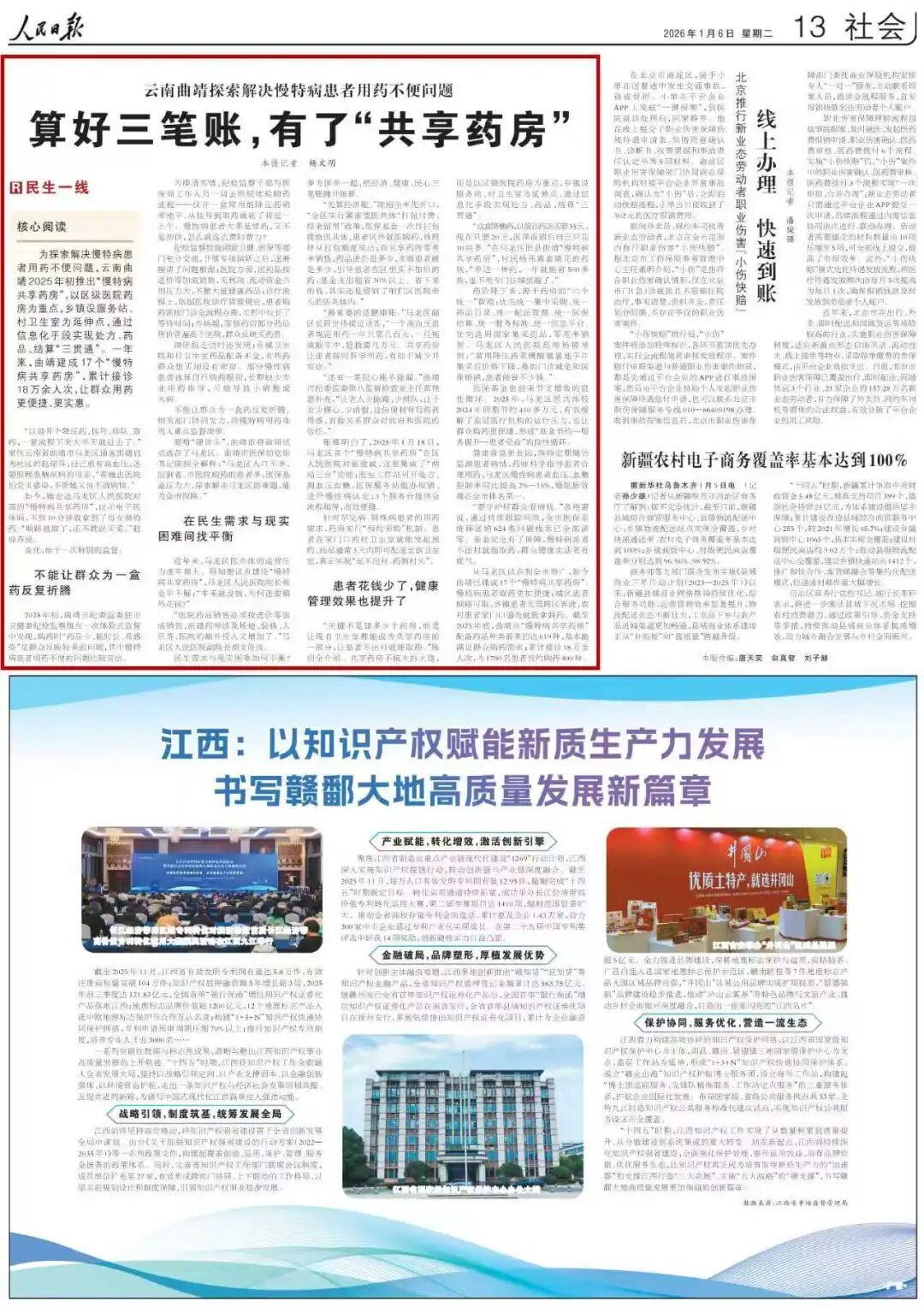2026年1月6日,人民日报社会版头条报道了《云南曲靖探索解决慢特病患者用药不便问题 算好三笔账,有了“共享药房”》。